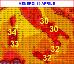 VENERDI 15 APRILE, la giornata più "critica". La Sardegna rischierà termiche compresa tra 33 e 34°; la Sicilia orientale e la Calabria Ionica veleggeranno sui 32°, Il Tavoliere delle Puglie e le zone interne dell’Abruzzo si attesteranno sui 30°.