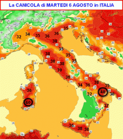 La cartina ci mostra le temperature attese nel pomeriggio di martedì 6 agosto. I 40° sono stati cerchiati in nero e riguarderanno le zone interne della Lucania e della Sardegna. Valori non dissimili ( 38-39°) saranno possibili nelle pianure interne tosco-laziali, sull’Emilia Romagna e le zone interne della Sicilia.
