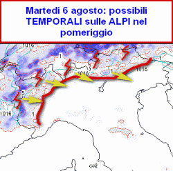 Solo i settori alpini e forse le zone di pianura immediatamente sottostanti potranno beneficiare di qualche temporale nel pomeriggio. La cartina inerente alle ore pomeridiane di martedì 6 agosto evidenzia questa possibilità.