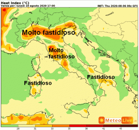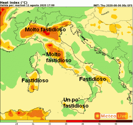 Questo invece è l’indice di calore previsto in Italia per il pomeriggio di martedi 11 agosto: