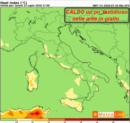 La prima mappa mostra l’indice di disagio da caldo atteso in Italia per la giornata di lunedi 13 luglio: