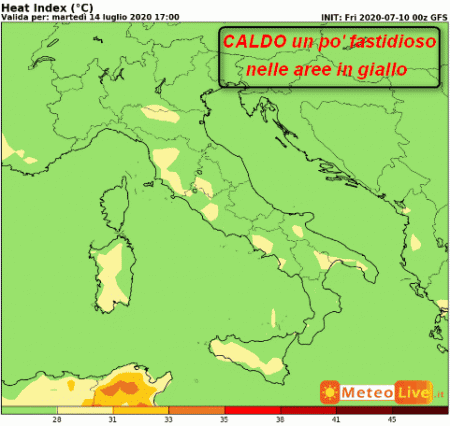 La mappa sopra mostra l’indice di disagio da caldo, chiamato anche INDICE di CALORE (si legga questo articolo per maggiori dettagli: www.meteolive.it/news/In-primo-piano/2/pillole-meteo-che-cos-l-indice-di-calore-/79464/.