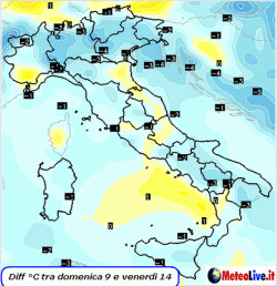 Il calo è quantificato in 4-6°C al nord, in 6-7°C al centro (in particolare sulle adriatiche) e in 5-6°C al sud. Da segnalare che, terminato l’afflusso della massa d’aria atlantica, ovvero a partire dal week-end del 15-16 settembre, la colonnina di mercurio si riporterà ai valori di partenza, per l’azione stabilizzante di un nuovo campo di alte pressioni.