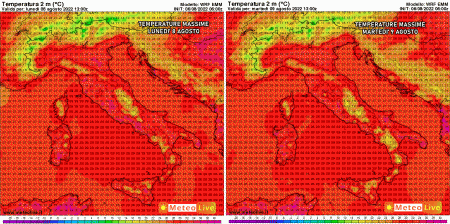 Da queste parole possiamo dedurre che le temperature non crolleranno improvvisamente ovunque, eccetto nelle località dove si abbatteranno forti acquazzoni e temporali. Come possiamo notare dalle massime previste tra lunedì e martedì ci sono ancora temperature piuttosto alte, superiori ai 31-32°C in tanti territori da nord a sud, con picchi isolati di 34-35°C.