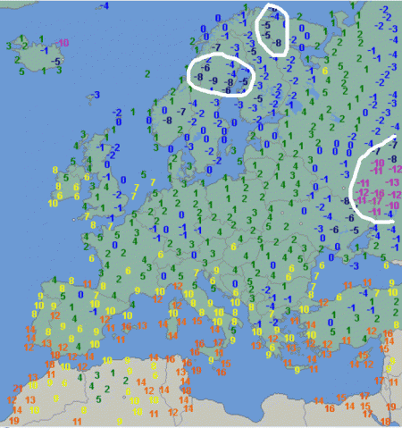 Il freddo più crudo questa mattina lo ritroviamo all’interno delle aree cerchiate in bianco, in particolare a nord del Mar Nero, dove sono presenti punte di -17° e nelle aree interne della Scandinavia dove il termometro si è avvicinato ai -10°.
