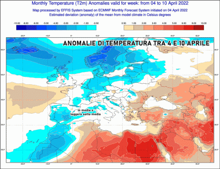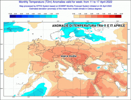 Le mappe da poco pubblicate mostrano la presenza quasi ininterrotta di temperature superiori alle medie del periodo praticamente dal 10 aprile fino all’inizio di maggio. Questo ci fa capire che le correnti prevalenti nel corso del mese saranno meridionali, quindi o africane o del medio Atlantico, mentre latiteranno le correnti più fredde da nord. Solo il periodo fino al 10 aprile riesce a sfuggire da questo lunghissimo sopra media termico, grazie ad un’improvvisa ondata di freddo attesa nel week-end (leggi qui maggiori approfondimenti).