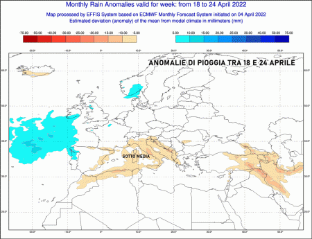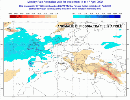 ECMWF ci propone anche le anomalie di pioggia nel corso di aprile. Il pannello del periodo 11-17 aprile ci mostra precipitazioni attorno alle medie del periodo, quindi favorevoli all’invadenza delle correnti atlantiche ricche di pioggia (e al tempo stesso di aria calda africana).