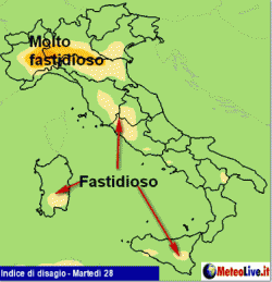 Ecco una cartina che ci mostra il grado di fastidio del caldo previsto in Italia per la giornata di martedì 28.