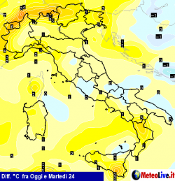La nostra nuova cartina evidenzia le differenze di temperature previste per martedì rispetto alla giornata di oggi.
