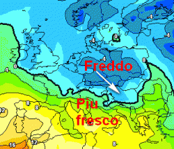 Come vedete dalla cartina sopra riportata, il freddo colpirà essenzialmente i paesi oltralpe, dato che l’affondo delle correnti perturbate non sarà incisivo.
