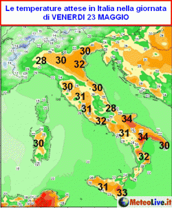 La cartina che vedete rappresenta le temperature massime attese in Italia nella giornata di venerdì 23, ovvero nel pieno dell’onda calda.
