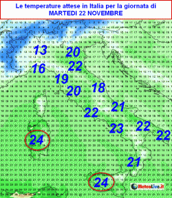 La prima mappa ci mostra le temperature attese in Italia nella giornata di martedì 22 novembre.