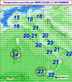 Mercoledì 23 novembre avremo valori assai simili alla giornata precedente (seconda mappa),