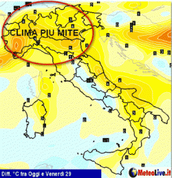 Leggermente piu contenuto ( attorno a 5-6°) risulterà l’aumento termico sul nord-est.