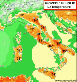 Ecco i 34° della Romagna e delle Marche, i 32°-33° delle zone interne della Toscana ed i 34° del Lazio e della Campania interna.