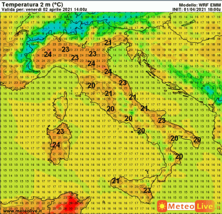 Punte di 23-24° al nord, lungo il versante adriatico e sulla Sardegna. Altrove temperature quasi ovunque superiori a 20°.