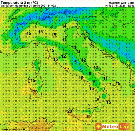 Per dare l’idea dello sbalzo termico che dovremo sopportare nelle prossime 48-72 ore, vi mostriamo il paragone tra le temperature previste al suolo per il primo pomeriggio odierno e quelle di Pasqua.