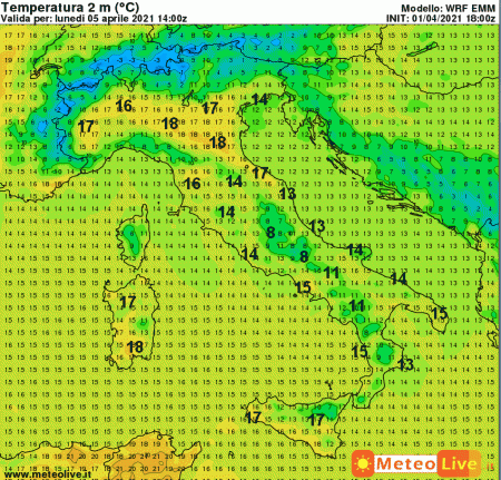 Infine, diamo un’occhiata alle temperature al suolo previste per PASQUETTA: