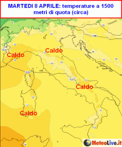 Entrando maggiormente nel dettaglio delle temperature previste in Italia per l’inizio della settimana prossima, ecco una cartina che ci mostra i valori termici attesi a 1500 metri di quota circa per la giornata di martedì 8 aprile.