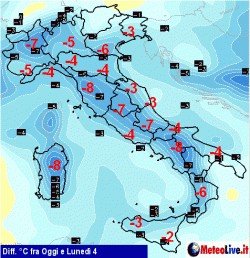 Ribadiamo ancora una volta di non farsi ingannare dai colori. La cartina che abbiamo riportato mette in luce le differenze termiche tra le temperature di oggi e quelle che si registreranno nella giornata di lunedì 4 novembre.