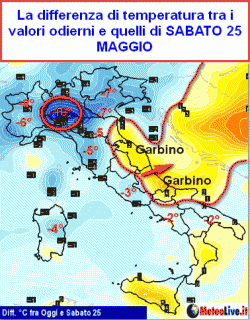 La notevole instabilità atmosferica che si verrà a creare sul nord Italia sarà causa anche di un sensibile calo delle temperature. Il rovesciamento freddo indotto dalle precipitazioni a prevalente carattere temporalesco farà calare i termometri di parecchi gradi, portando un clima decisamente insolito per la stagione in corso.