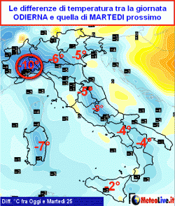 Nei giorni scorsi ha fatto indubbiamente troppo caldo. Di conseguenza la cartina che mostra le differenze termiche tra la giornata di oggi e quella di martedì prossimo non deve spaventare più di tanto. Arriveranno temperature molto più basse di quelle che abbiamo ora, ma le gelate in pianura dovrebbero essere escluse.