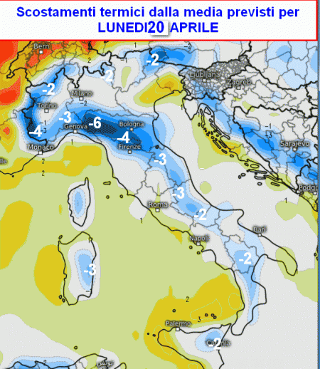 Ora guardate cosa potrebbe succedere lunedi 20 aprile, sempre in merito agli scostamenti termici dai valori normali del periodo: