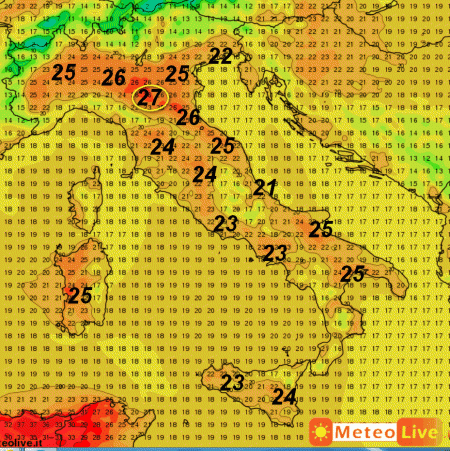 27° sono attesi sulla pianura emiliana, 25° sulla Sardegna, sulle Marche e sulla Puglia; 25° anche tra la pianura piemontese e lombarda. Su tutte le altre regioni avremo valori termici più basso, ma quasi ovunque al di sopra dei 20°