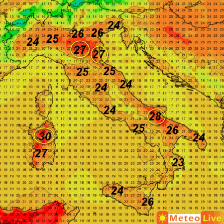 Spunteranno i 30° nelle aree interne della Sardegna; 28° nel Foggiano, 27° sulla pianura emiliana, 26° sul Tavoliere delle Puglie, sulla Sicilia orientale e sulla pianura padano-veneta.