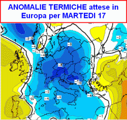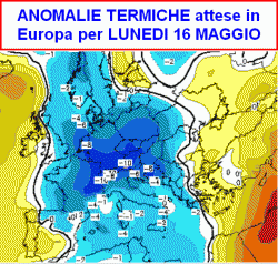 La prima cartina ci mostra le anomalie termiche attese in Europa nella giornata di lunedì 16 maggio. Fanno sensazione i 10° al di sotto della media che si prevedono sui settori transalpini.