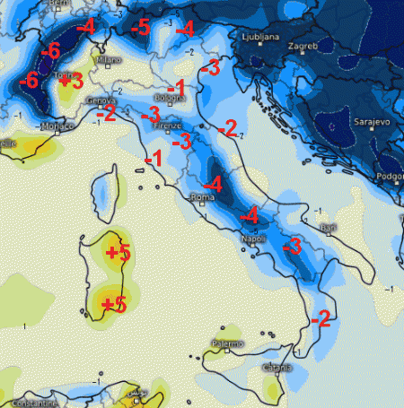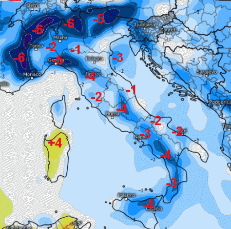 Oltre alla Sardegna, che presenterà esuberi fino a 5° dalla media, avremo 3° in piu rispetto ai valori normali sul Piemonte e 2° in più su parte della Sicilia. Sul resto d’Italia i valori resteranno ancora sottomedia, fino a 6° in meno sulle Alpi e 4° in meno sull’Appennino centrale.