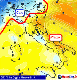 Più incisiva invece la sua azione per quanto riguarda la manipolazione del campo termico sulle varie regioni italiane. Da segnalare un temporaneo calo al nord a causa della maggiore nuvolosità diurna e delle eventuali precipitazioni associate. Un richiamo caldo a precedere sul lato meridionale la banda nuvolosa investirà invece il nostro centro-sud.