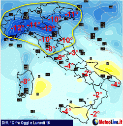 La cartina in questione raffigura la differenza di temperatura tra i valori di oggi e quelli previsti per la giornata di lunedì 16 giugno. Al nord domina il blu scuro, segno che tale differenza sarà piuttosto marcata.