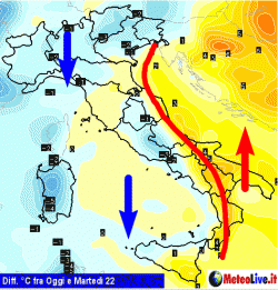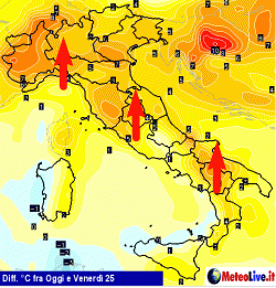 Gli sbalzi più evidenti si avranno durante il transito dei sistemi frontali, quindi almeno fino a tutto lunedì 21. Si assisterà ad un calo generale al centro-nord e sulla Sardegna, ad un rialzo, anche sensibile invece all’estremo sud. Poi ecco l’inversione di