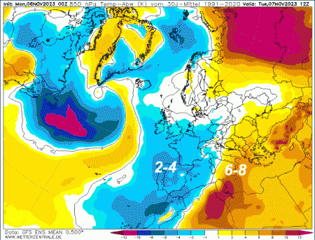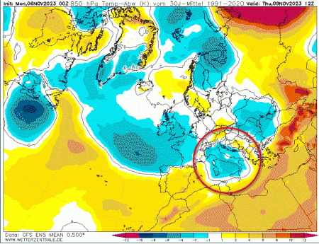 La prima mappa mostra gli scarti termici dai valori normali a 1500 metri previsti per la giornata di domani, martedi 7 novembre: