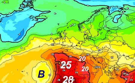 A 1500 metri di altezza, l’isoterma + 20° dovrebbe interessare solo la Sardegna e il settore di nord-ovest, dove avremo i maggiori disagi. Notate la risalita bollente che avverrà più ad ovest, con valori da capogiro specie in sede iberica.