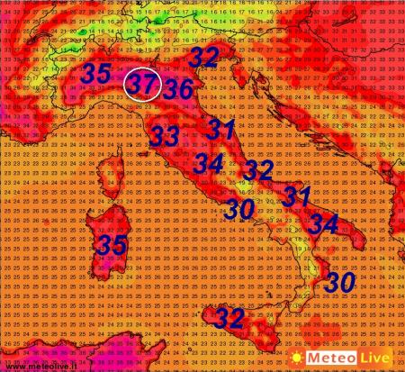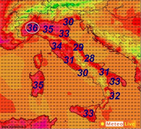 Punte di 35-36° sulla Pianura Padana occidentale; 35° sulla Sardegna e 34° in Toscana. Leggermente meno caldo lungo il versante adriatico con valori sotto i 30°.