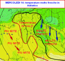 Come anticipato poco sopra, le correnti settentrionali investiranno frontalmente il versante adriatico e le zone interne del meridione. Qui avremo valori prossimi a 2° a 1500 metri, circa 12-14° a livello del mare.