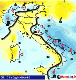 2° in meno sono attesi anche sulla Sardegna orientale, mentre su tutte le altre regioni non si avranno variazioni significative sui termometri, anzi, lungo il Tirreno l’azione di sottovento delle correnti orientali che scenderanno dall’Appennino potrebbe addirittura determinare contenuti aumenti.