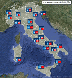 Le temperature aumenteranno in maniera più netta sulle Alpi e al centro-sud, dove i valori potranno sforare le medie anche fino a 12°C. Meno sensibile a la scaldata in val Padana per l'insistenza di strati nebbiosi o di nubi basse legate ad una situazione di inversione termica.