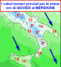 Le correnti settentrionali che affluiranno dietro al fronte faranno scendere le temperature, specie nelle zone interne del meridione e sulla Puglia.
