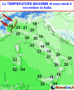 Oltre alle zone pedemontane del nord-ovest, si prevedono temperature attorno a 24° sulla Sardegna sud-orientale e sulla Sicilia meridionale, sempre per il medesimo motivo ( effetto di compressione delle correnti da nord-ovest sui rilievi retrostanti).