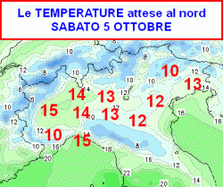 Qui invece ci occuperemo delle temperature. Siamo all’inizio di ottobre e il settentrione si prepara ad un sabato decisamente autunnale. L’atmosfera uggiosa ci ricorderà che la bella stagione è ormai definitivamente alle nostre spalle, con la neve che potrebbe farsi verdere tra i 1500 e i 1800 metri nel Cuneese.