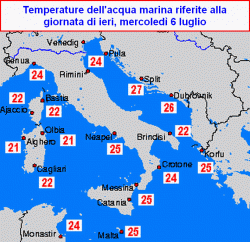 Ne risultano temperature si calde ma non troppo, con valori compresi quasi ovunque tra +24 e +25°C. Picchi di +26°C li riscontriamo soltanto su alcuni limitati settori del mar Adriatico, laddove è presente un’area particolarmente tiepida con un valore addirittura di +27°C. In questo caso la presenza di valori termici più elevati, trova risposta nella scarsa profondità del fondale presente in questi settori, il mar Adriatico risulta inoltre particolarmente chiuso e riparato, pertanto soggetto quasi sempre durante l’estate ad un riscaldamento più rapido rispetto ai bacini marini occidentali.