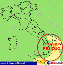 La cartina che vi proponiamo oggi riguarda l’indice di disagio da caldo. Come vedete, quasi tutta la nostra Penisola risulta colorata di verde, di conseguenza il disagio per il caldo è assente o minimo. Merito delle intense correnti settentrionali che si sono attivate al seguito del passaggio del fronte avvenuto ieri sul nord Italia.