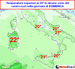 In Sardegna, specie nelle pianure interne, si potrebbero toccare i 22°; 20-21° saranno raggiunti nelle zone settentrionali della Sicilia, sulla Lucania e sul Tavoliere delle Puglie; 20° anche nelle pianure interne del Lazio, Roma compresa.