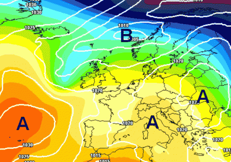 Come si può notare dalla mappa, non ci sono ancora strutture depressionarie in grado di impensierire lo strapotere dell’alta pressione che da oltre 10 giorni è unica protagonista del tempo in Europa.