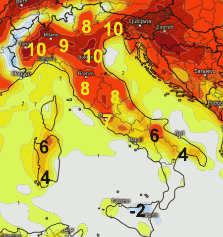 Come vedete, il quadro delle anomalie termiche cambierà poco. Sarà sempre il nord e il centro ad avere tra i 7 e i 10° superiori alle medie del periodo. Persisterà anche il lieve sottomedia sulla Sicilia nord-orientale (circa 2° in meno rispetto alla norma); in media termica la Calabria, mentre altrove si viaggerà tra i 4 e i 6° sopramedia.