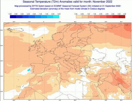 Dal punto di vista termico, anche novembre non sembra portare notizie molto confortanti. Ecco le anomalie termiche che si prevedono a scala europea:
