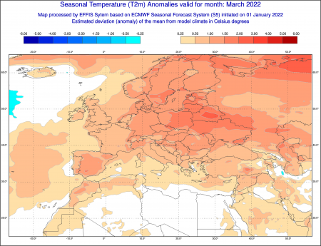 Secondo questa mappa, sembra che ci sarà ben poco da gioire. Anomalie termiche al rialzo un po’ su tutto il Continente, anche piuttosto marcate. In Italia, sempre secondo questo modello, si andrebbe da 1 grado e mezzo di esubero delle regioni settentrionali fino al mezzo grado di esubero sulle Isole e le estreme regioni meridionali.